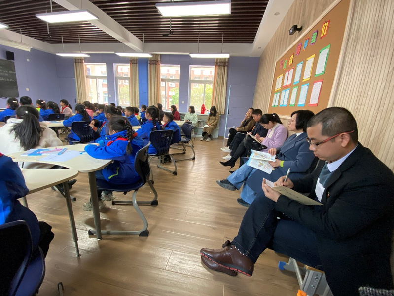 随后,初教教工党支部党员分成小教和学前两队,聆听了池淮镇中心学校支部党员的公开课并与老师和孩子们进行课堂互动、交流。