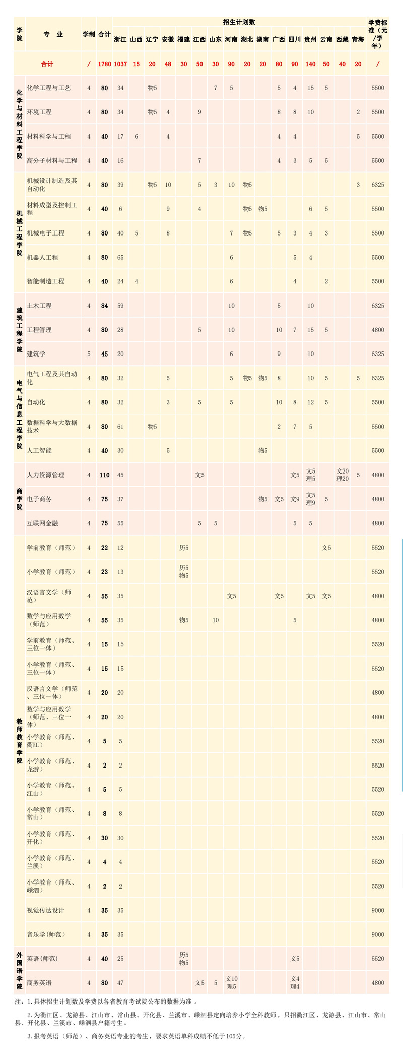 2021年我校共有30个招生专业,其中27个本科专业、3个高职(专科)专业。主要变化包括:1.新增人工智能本科专业招生,暂停物联网工程本科专业招生;2.新增汉语言文学(师范)、数学与应用数学(师范)三位一体招生;3.新增小学教育(师范)专业在衢江、嵊泗的定向招生计划;4.暂停应用化工技术高职专业招生,恢复建筑工程技术高职专业招生。
