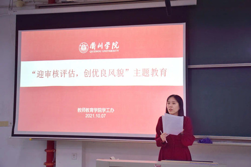 学院学工办副主任丁静以“迎审核评估,创优良风貌”为主题,重点从“什么是本科教学审核评估”“为何要进行本科教学审核评估”“如何做好本科教学审核评估”三个方面向与会学生干部传达了审核评估的各个要点。她指出,做好本科教学审核评估的秘决在于牢记五项原则:以大局为重;以迎评为己任;校兴我兴,校衰我耻;积极参与迎评,自觉服务迎评,共谋学校发展;积极维护学校良好形象,不做有损学校利益的事,不说有损学校形象的话。她要求全体学生骨干做好应知应会问答准备,树立良好榜样模范。