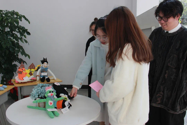 在油画作品中,不乏一些我们熟悉的作品,如《呐喊》《带珍珠耳环的少女》,而同学们结合现实与灵感通过对这些名画的再创作,将画中主人公替换成小动物,用油画棒和墨水重新赋予其特殊的含义。另一边的编制作品和手工玩偶同样凝结着同学们的心血,他们充分利用衣物、袜子、毛线等各种材料,进行一针一线的缝合、编织、加工,用自己的双手创造出生动可爱而富有童趣的玩偶。