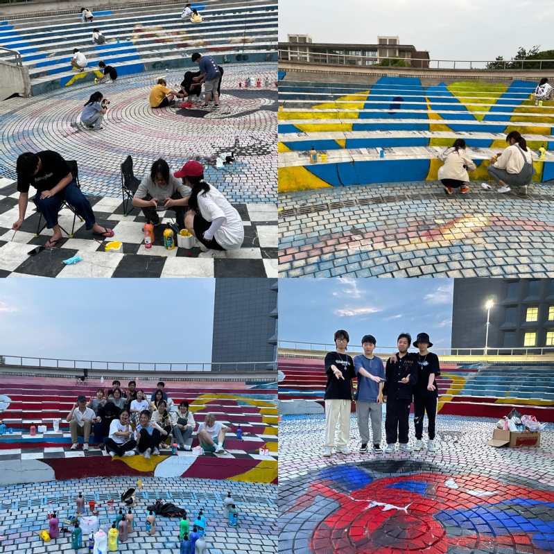 好事总多磨,几日的连绵雨水让同学们无法将美化窨井盖工作一气呵成。但21视传的同学们不轻言放弃。因为在他们的眼中,这是他们美化校园的职责。既是职责所在,就当持之以恒,哪怕是利用周末休息时间作画。尤其是大学生活动广场的大幅地面场景,无论是构型打底,还是色彩搭配,乃至于体力上,对创作者们而言都是一次有挑战性的考验。“纸上得来终觉浅,觉知此事要躬行”,正如邹老师所说,“现场做画与纸上做画是不相同的”。既是心之所向,便应素履以往,以少年之热忱,无惧风雨,勇往直前。