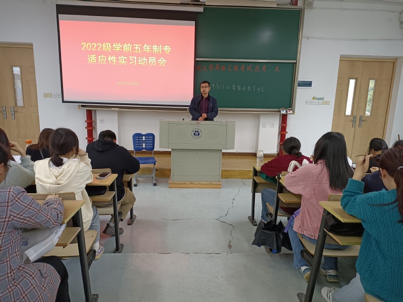 经过1个多月的实习准备,伟德国际victor·1946源自于2023年4月6日召开了2022级学前教育五年制专适应性实习动员会。全体实习生、实习指导教师、教务办人员参加了此次实习动员会,会议由分管教学副院长周兴平主持。