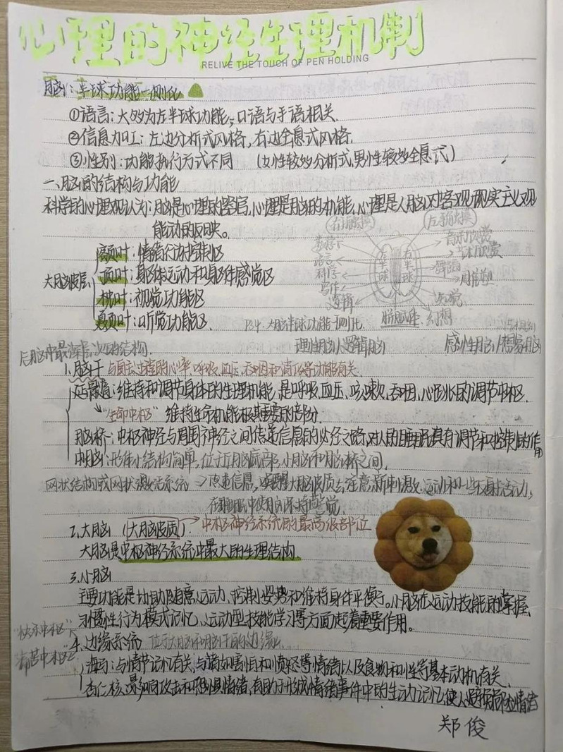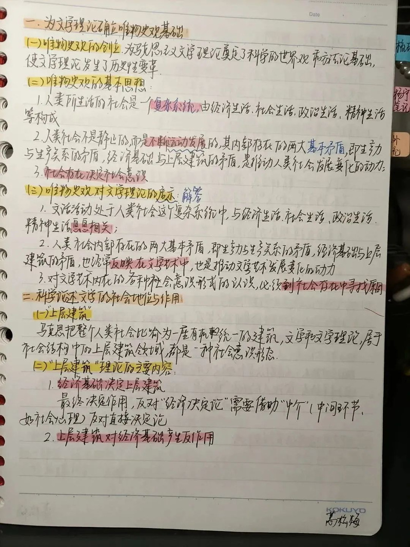 我做笔记的理念是“依色记忆”,我会根据笔记的层级用不同颜色的荧光笔标记,重难点也用专门的颜色提醒自己。这样记住内容的同时,我也记住了对应内容的重要级。构建了一个有色且清晰的思维层级,便于我的长期记忆。