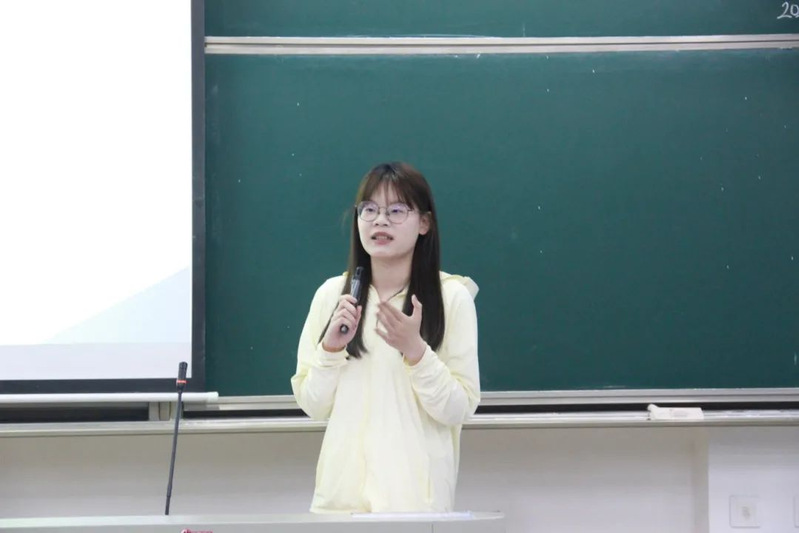 22中文1班的葛松梅介绍了大学生乡村振兴创意大赛。首先她简要介绍了比赛的周期、赛制与内容:赛制包括主体赛和专项赛,主体赛包括招标村和自选村,其中又包含着四个赛道。接着她对“乡村调研”这一模块进行了深入讲解,她提出应做到落地落实,多记录多拍照多思考,积极利用互联网工具对项目进行宣传。葛松梅提醒大家,在参赛中要时刻保持冷静和理智,不骄不躁,胜不骄败不馁,做自己就是最棒的。