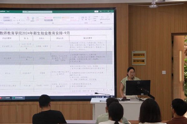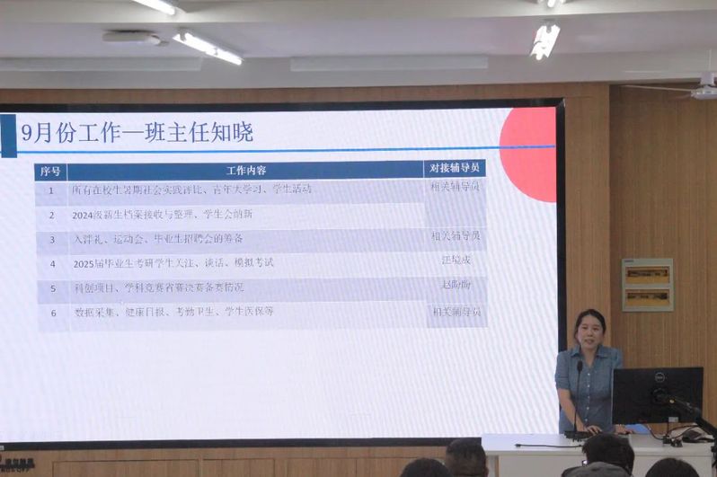 学工办主任丁静介绍了学院招生就业情况,分析了2024届毕业班的就业率、考编率以及升学率,总结过去一年教育教学工作的经验与成绩,并对新学期班会、班委换届、评奖评优、优良学风班评定、谈心谈话、学业预警、寝室走访等作了部署。新生辅导员田雪腾对2024级新生入学教育和军训工作进行了安排,辅导员汪境成对资助政策进行了解读,提醒各位班主任要做好贫困生帮扶工作。