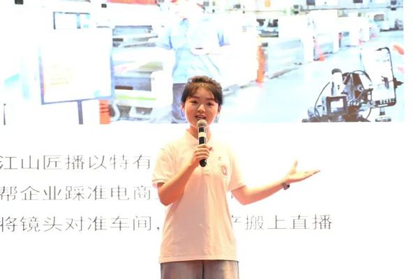 来自22小教2班的宣讲员徐博萌通过俏皮的语言,带师生“走进”江山大火的车间直播现场,讲述传统制造搭上互联网快车的创新之举,深入浅出地阐释了实体经济和数字经济融合的发展之路。“党的二十届三中全会指出要全力保障民营企业发展,而“三通一达”便是中国民营企业发展的缩影……”22学前张艺方以快递行业为切入点,围绕“筚路蓝缕”“风起云涌”“日驰千里”三个关键词,将“汗水快递”到“智慧快递”发展蜕变的故事娓娓道来。22中文1班的李宓璇和23小教2班的汪艺迎则将目光聚焦在三山村、大同镇等乡镇,讲述在乡村振兴之路上,党建引领、“农创客”领跑、产业升级的生动实践,铺展了一幅幅美丽乡村新图景。