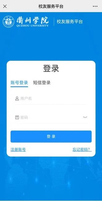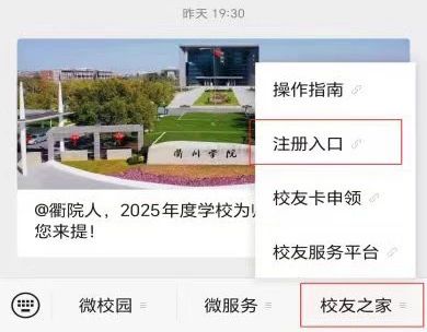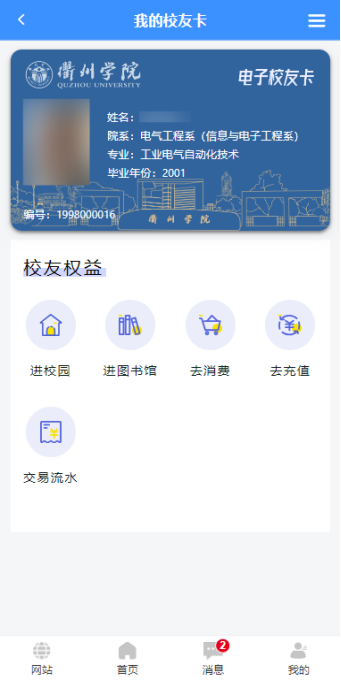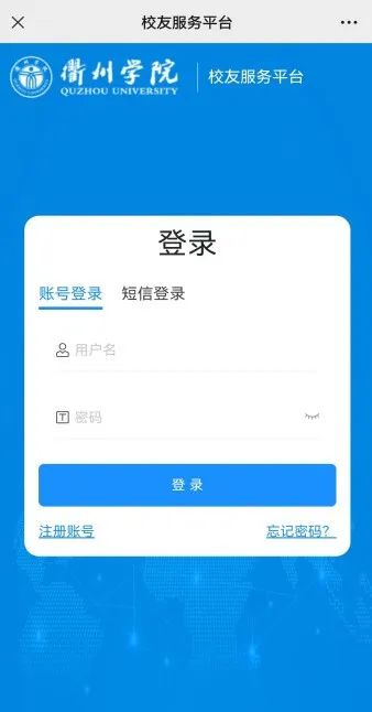 选择【浙江省衢州市】,选择【伟德victor1946电子校友卡】自动跳转至注册页面。