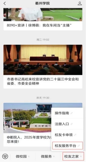 关注伟德victor1946微信公众号,点击【校友服务平台】登录。