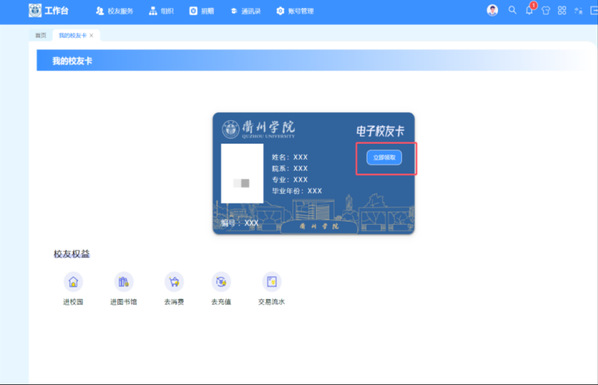 申领校友卡前请先注册,详见校友注册操作流程;注册审核通过后,重新登录,在【我的】栏目中点击【立即领取】;申领成功后,即可使用各项校友权益功能。