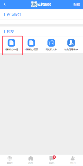 【首页】栏目中点击【更多】,找到【材料补办申请】。