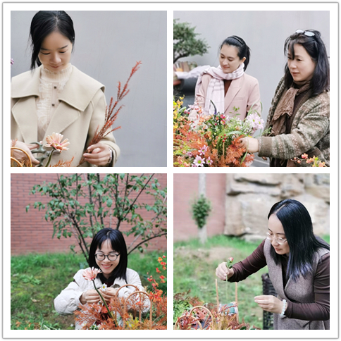 在花艺活动现场,专业花艺老师现场教学,讲解了花材的品种、寓意、色彩搭配以及插花的层次构建等内容,并现场演示了插花的步骤和技巧。在老师的指导下,女教师们全神贯注,挑选花材、巧妙裁剪、精心搭配,不断地交流着技巧,现场气氛十分活跃、温馨,大家沉浸其中,就这样一盆盆造型各异、精致美丽的插花作品便诞生了,每个人都充满了成就感,并拍照留念。