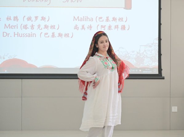活动现场亮点纷呈,从温馨动人的歌曲《朋友》到七国学生一同朗诵的诗歌《诗意中国》,再到趣味横生的互动游戏和十国学生的时装走秀,无不展现着多元文化的魅力与活力。来自俄罗斯、巴基斯坦、塔吉克斯坦和阿塞拜疆的五位同学带来了民族舞蹈表演,热情邀请在场师生共舞,营造了欢乐和谐的节日氛围。