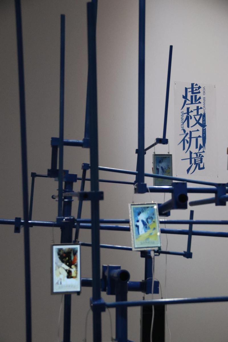 而在展厅一角,一棵机械“祈福树”同样备受瞩目。钢管枝桠上悬挂着电子屏幕,取代了传统的祈福纸牌。“虚枝祈境”是一款融合中华传统祈福文化与现代数字技术的艺术装置,旨在探索传统文化在数字化时代的创新表达与用户体验。该装置的灵感源自古老的樟树祈福习俗,通过数字化手段赋予其全新的生命力与表现形式。装置的核心是一棵由钢管构建的现代化“祈福树”,其枝桠象征着科技与自然的交汇。传统的祈福纸牌被电子屏幕取代,生成动态的祝福图景,装置借助数字化技术,使祈福行为更加个性化、即时化,同时保留了传统文化的核心价值,展现了数字化时代文化表达的无限可能。