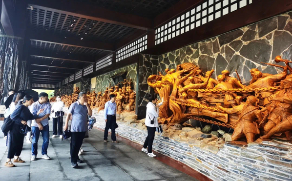 在浙西红色文化根雕艺术博物馆内,500余件根雕作品以独特的艺术形式,生动再现了中国共产党百年奋斗的光辉历程。从“开天辟地”的红船初心到“中国梦”的时代图景,从“长征路上”的苦难辉煌到“七大战役”的烽火记忆,师生党员沿着“历史长廊”驻足细观,每一件作品都是对革命历史的深刻诠释。师生党员们漫步在“历史长廊”中,细细品味每一件根雕作品背后的故事,深刻感受革命先辈们为了民族独立和人民解放所付出的巨大牺牲和不懈努力。