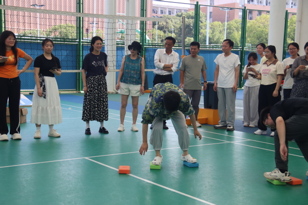 随着裁判清脆的哨声响起,“踏石破浪”项目率先开始。脚下“砖石”飞快交替,老师们化身平衡大师!你来我往,加油声、欢呼声此起彼伏。看音乐系毛玲灵老师,步伐轻盈如奏乐章,速度与优雅并存。
