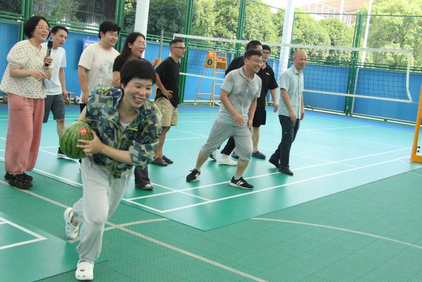 圆滚滚的西瓜成了接力棒,“护瓜使者”们奋力奔跑!紧张刺激的交接区,“接住!”“快传!”声声入耳。最逗趣?黎老师一个“脚滑”,“西瓜开花”引爆全场笑点!中文系沈茂生老师诗兴大发:“这一摔,摔出的是奋勇向前的勇气!”