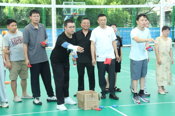 目光转向“沙场点兵”区域,彩色沙包齐飞,一个个沙包划出一道道优美的弧线。目标框前老师们化身“神投手”。“哎呀,差一点!”“漂亮!”每一次投掷都扣人心弦,无论进否,笑容最灿烂!