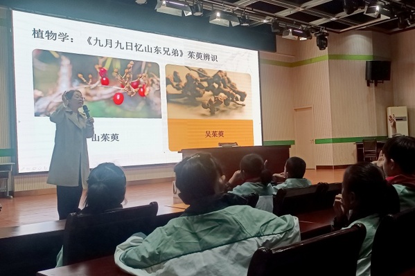 继“春之章”探究后,刘教授以王维《九月九日忆山东兄弟》为起点,带领学生们探索“重阳的智慧”。她先引导学生结合诗句梳理“登高”“插茱萸”等重阳习俗,再聚焦“茱萸”展开科学辨析,通过图文对比区分山茱萸、吴茱萸等品种特征,打破认知误区。