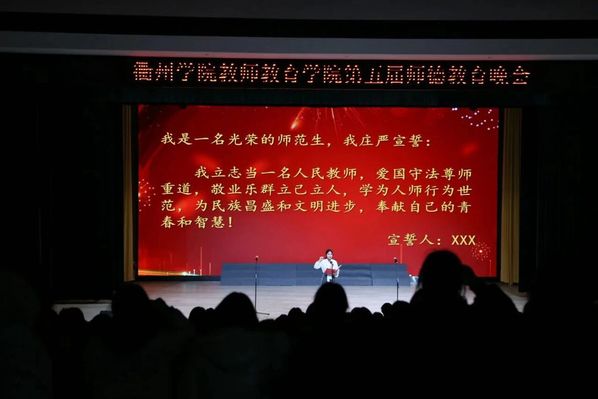 庄严的师范生集体宣誓将晚会推向高潮。全体师范生肃然起立,誓言铿锵有力,目光如炬似火,生动展现出未来教师的风骨与担当。