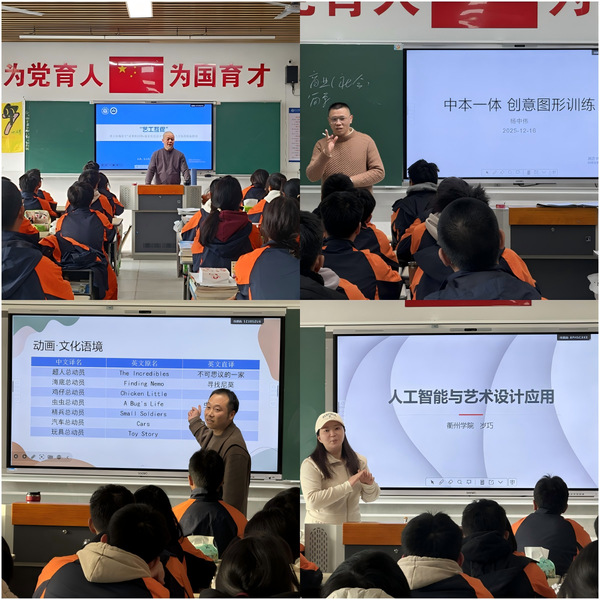 专题学习研讨结束后,艺术设计系毛立洪老师和杨中伟老师面向高一学子,先后讲授《“艺工互促” 新文科背景下“计算机应用+视觉传达设计”中本一体人才培养始业教育》《创意图形训练》两门课程;岁巧老师与杨勒老师则为高二学子带来《人工智能与艺术设计应用》《认识三维动画》专题授课。4位教师立足学科前沿与学生认知特点,以深厚的专业积淀和生动的教学表达点亮课堂,同学们精神饱满、积极讨论;课堂氛围热烈融洽,既点燃了学子们的学习热情,也深化了同学们的专业认知,为后续“艺工互促”人才培养奠定了坚实基础。