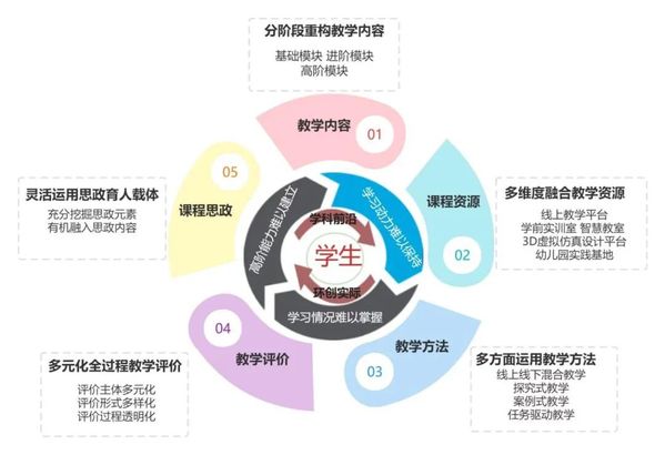 面对课程内容零碎繁杂、学生难建高阶能力的痛点,徐丽丽老师直接打破了原有的教材结构,把课程内容重构为基础模块、进阶模块、高阶模块三大阶段,带着学生层层递进吃透环创核心。从环创的理论概念、原则方法等基础知识打底,到室内外环境、心理环境、家园社区环境的实践应用,再到环创综合设计、前沿问题探索、创新能力与团队协作培养,原本零散的知识点被串成了清晰的知识链条。学生再也不用死记硬背零散的规则,而是一步步建立起 “懂理论、会设计、能评价、善创新”的完整能力体系。