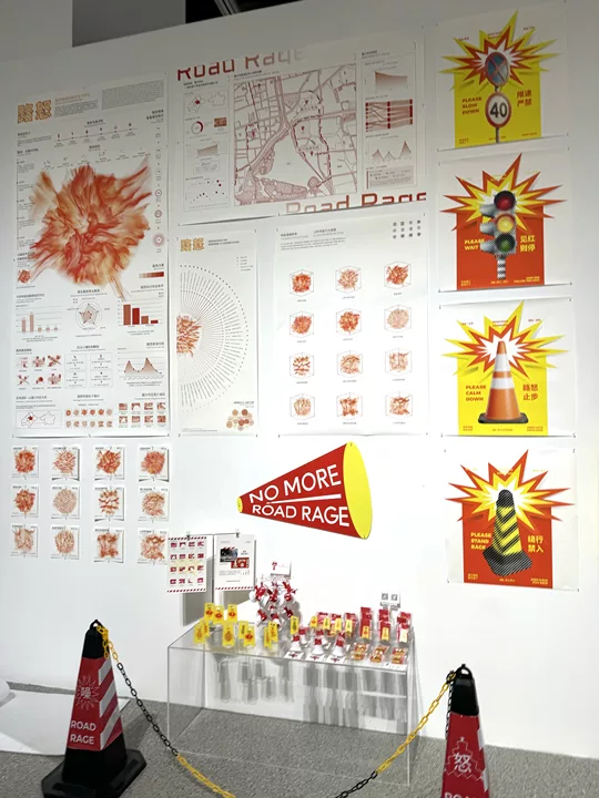 展览现场,严依晴同学的信息可视化设计作品《路怒》,凭借兼具理性思辨与人文关怀的表达,吸引了众多观众驻足。创作者深入实地开展调研,将路怒情绪的演化阶段、行为特征与群体差异,转化为直观清晰的视觉语言,更配套打造了交互装置《公共出气筒》,既完成了对社会现象的深度拆解,也搭建了具象的情绪疏导出口,让设计跳出纸面表达,拥有了直面现实问题的力量。严依晴表示:“我们希望通过设计这一微观视角,让公众读懂情绪背后的逻辑,也让设计真正走进生活、服务于人。”