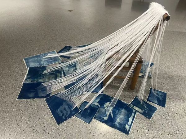 除了聚焦社会议题的创作,童钿同学的装置作品《她》同样令人动容。作品以母亲为核心主角,讲述了她在与创作者相仿的年纪,曾是独立自信的理发师,却因家庭责任,将自我需求后置,默默奉献。创作中,童钿以蓝晒工艺呈现母亲过往与当下的生命轨迹,搭配三维空间装置,让记忆与现实可视化;以竹椅为载体,用白线模拟理发披肩的形态,既象征母亲的职业印记,也暗喻其被家庭与责任包裹的处境。作品融入互动设计,暗藏镜子与剪刀元素,观众需亲手剪断缠绕的白线,才能看见镜中自己,既呼应主题,也传递出核心诉求——愿每个女性都能挣脱束缚,先做自己,再成为妻子与母亲,让自我价值被看见。